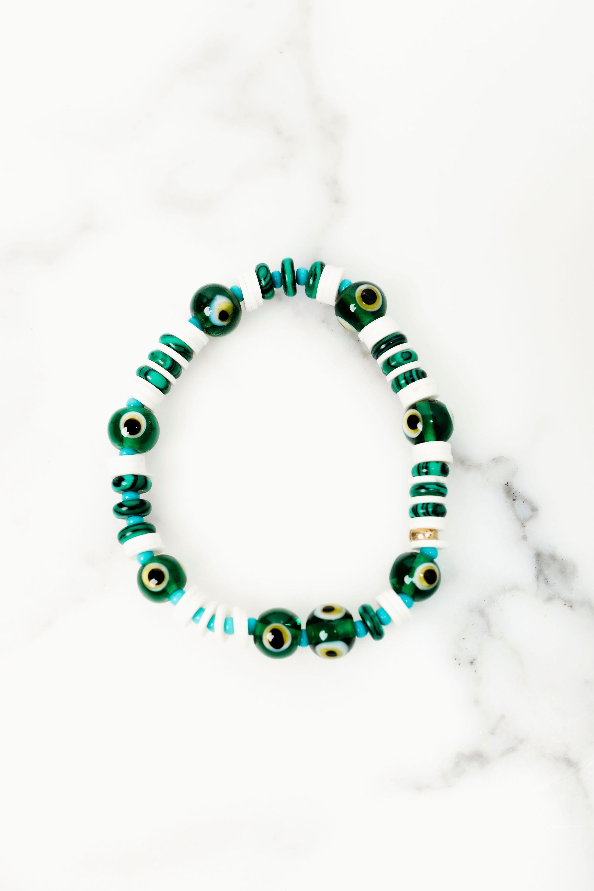 Embrace the mystical charm of our Zola Bracelet! This playful stretch design features an eye-catching evil eye green glass bead, complemented by sleek white vinyl and faux malachite rondells. The glass turquoise spacers add a pop of color that makes this bracelet perfect for stacking or wearing solo. Ward off bad vibes while elevating your accessory game!