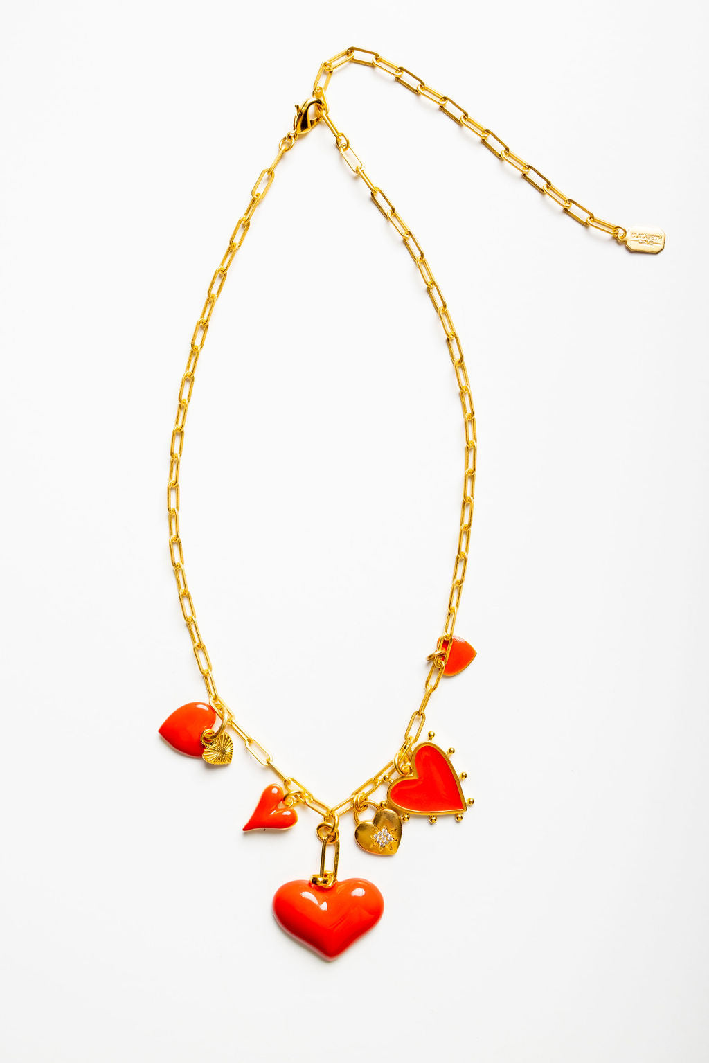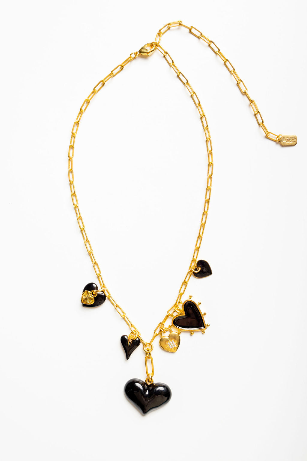 Upgrade your jewelry game with the Mercedes Necklace! This unique piece features a collection of graduated hearts, available in smooth red or black enamel, on a delicate golden chain. Make a bold statement and add a touch of quirky charm to any outfit. (Bonus: it's the perfect gift for any car-loving fashionista!). 24kt Gold Plate, Proudly Made in the USA.