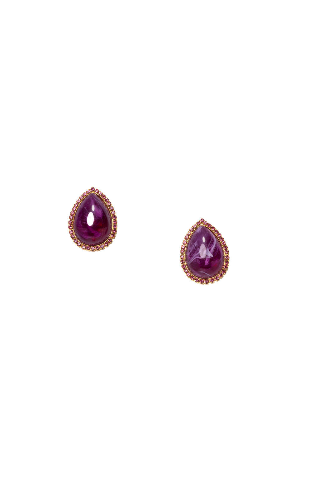 The Agnette Earrings showcase vintage acrylic pear-shaped stones, available in rich green or elegant purple hues. Each stone is surrounded by a sparkling crystal halo, offering a refined touch of glamour. These earrings combine classic style with a sophisticated color palette, perfect for adding a graceful accent to any ensemble.24K Gold Plate. Post Closure. Proudly made in the U.S.A