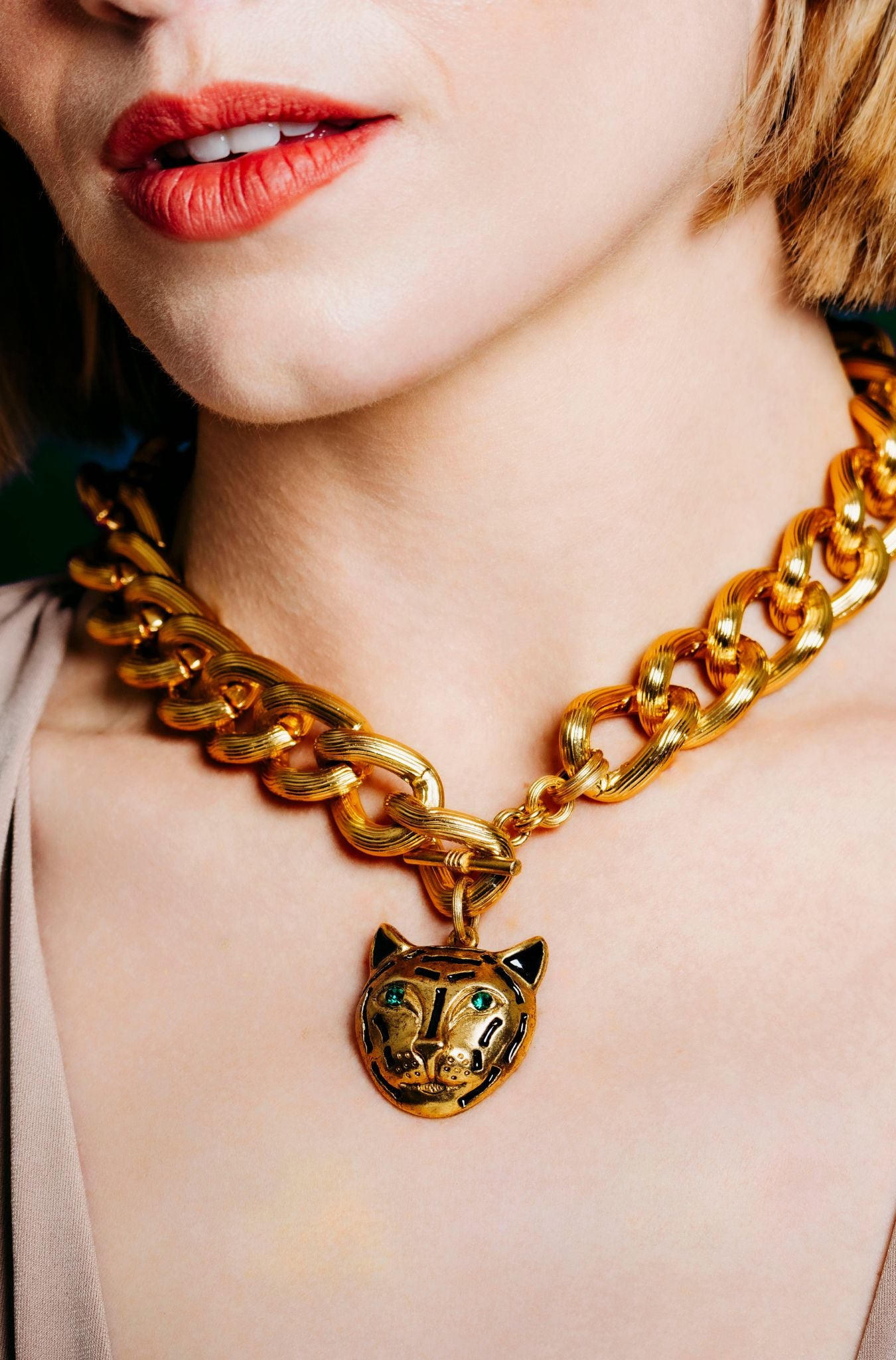 Make an unforgettable entrance with the Maxima Necklace, a piece designed for those who command respect. Substantial interlocking oval links create visual impact and movement, while the toggle front clasp offers practical elegance. The true showstopper: a fearless cheetah head charm adorned with black enamel markings and hypnotic green crystal eyes that gleam with untamed magnetism. Bold, unapologetic, and impossible to ignore—this necklace announces your arrival before you speak a word. 24K Gold Plated. Proudly created in the U.S.A