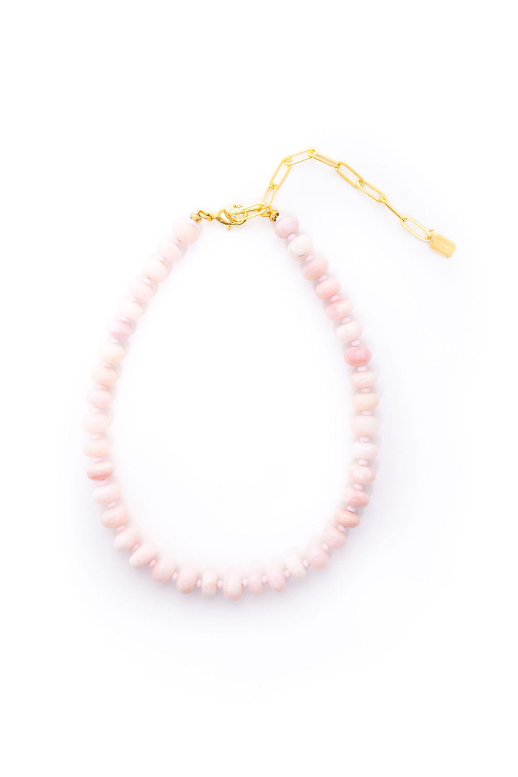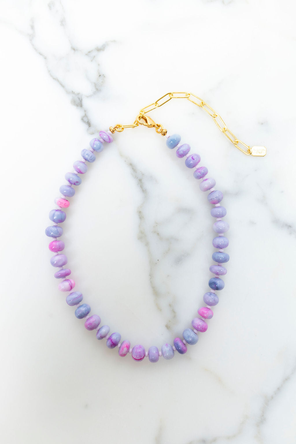 The Viondra Necklace features a harmonious blend of purple or pink glass opal beads paired with soft pink agate glass spacers. This thoughtfully designed piece offers a gentle pop of color that supports your natural elegance and brings a sense of calm and beauty to any look. A versatile accessory to uplift your everyday wardrobe.24K Gold Plate. Lobster Claw Closure. Proudly made in the U.S.A