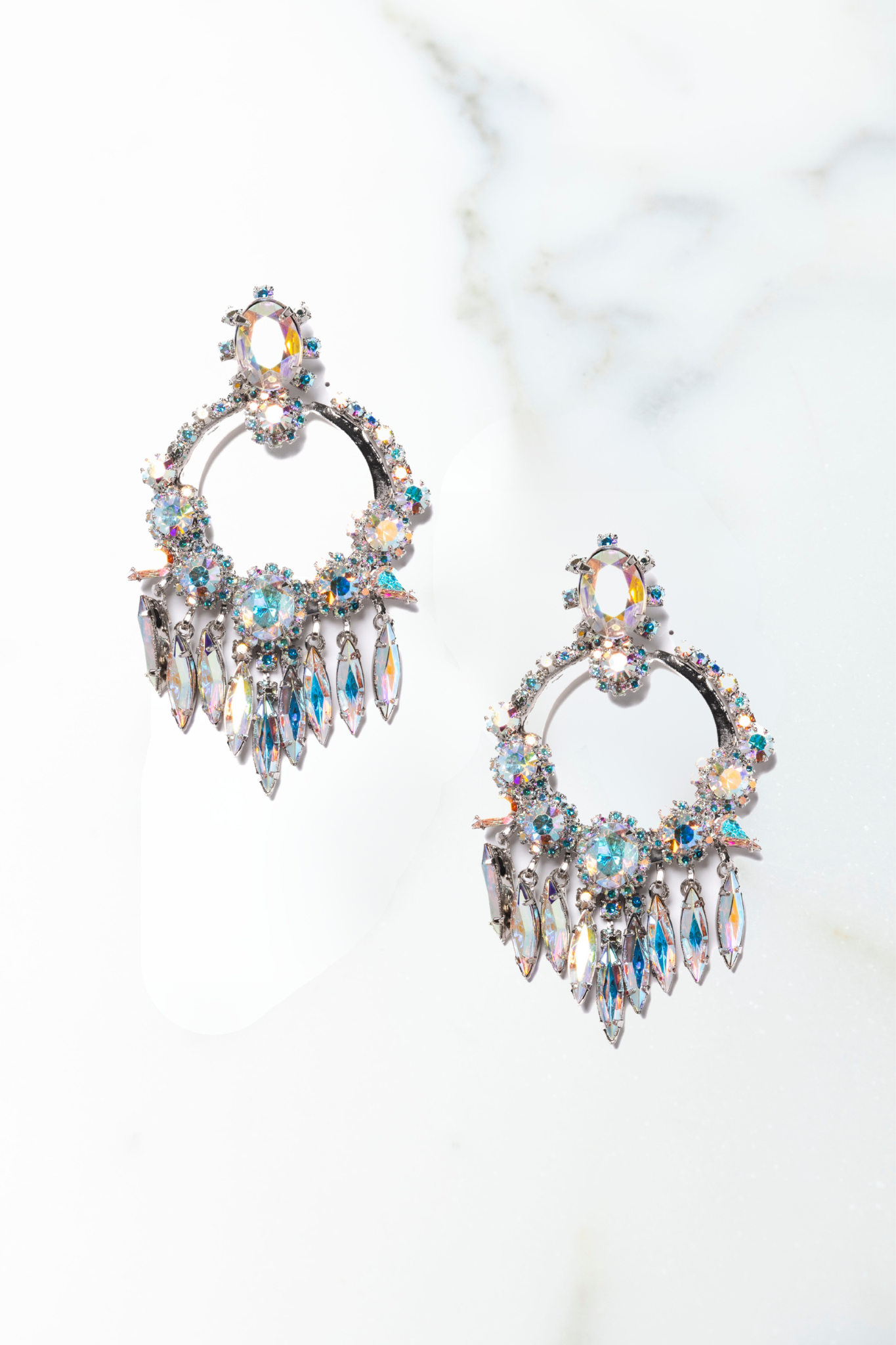 Make a statement with the Fiona Earrings, featuring a oval topper encircled by sparkling crystal or faux turquoise stones, resting elegantly above a stone-outlined hoop. Multi navette-shaped dangles complete the look, available in your choice of faux turquoise, aurora borealis, blush, or vintage glass jade stones. These earrings effortlessly blend bold design with vibrant color, perfect for adding a touch of glamour to any outfit.24K Gold Plate. Rhodium Plate. Swarvoski Crystals Post Closure. Proudly Handcrafted in the U.S.A