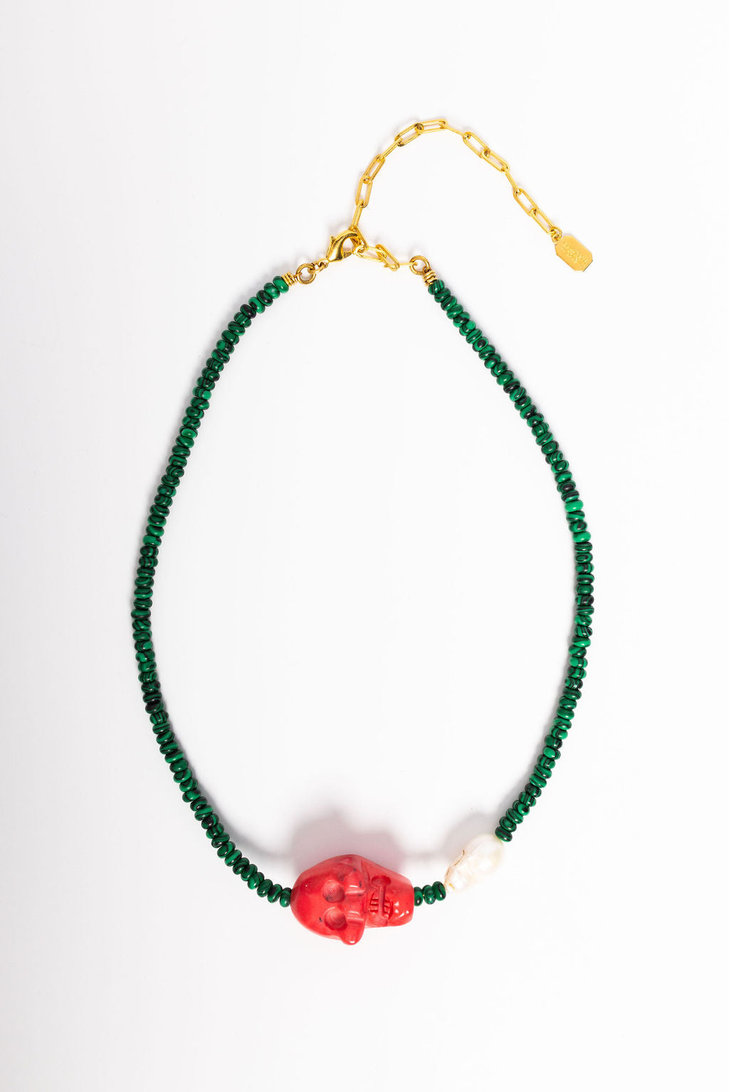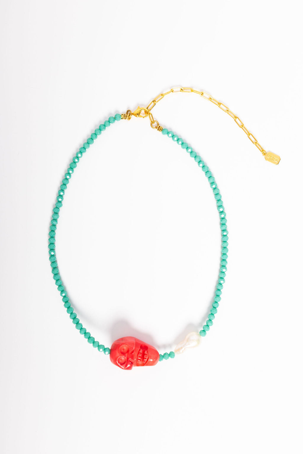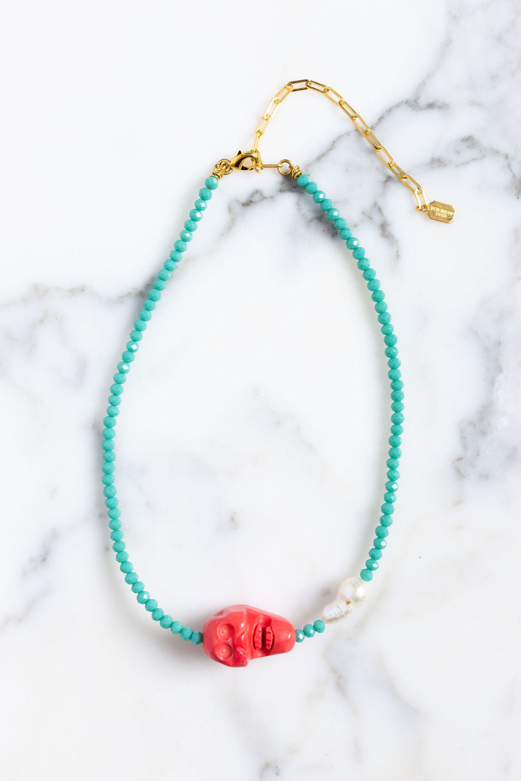 Dare to make a statement with the Meiko Necklace, a fearless design that pairs vibrant hot pink skull beads with rich faceted turquoise beads for an edgy-meets-elegant vibe. Anchored by a lustrous freshwater pearl, this piece balances bold attitude with timeless sophistication. Proudly handcrafted in the USA, it's the perfect accessory for anyone who refuses to play it safe. 24K Gold Plate. Lobster Claw Closure, Handcrafted in the U.S.A