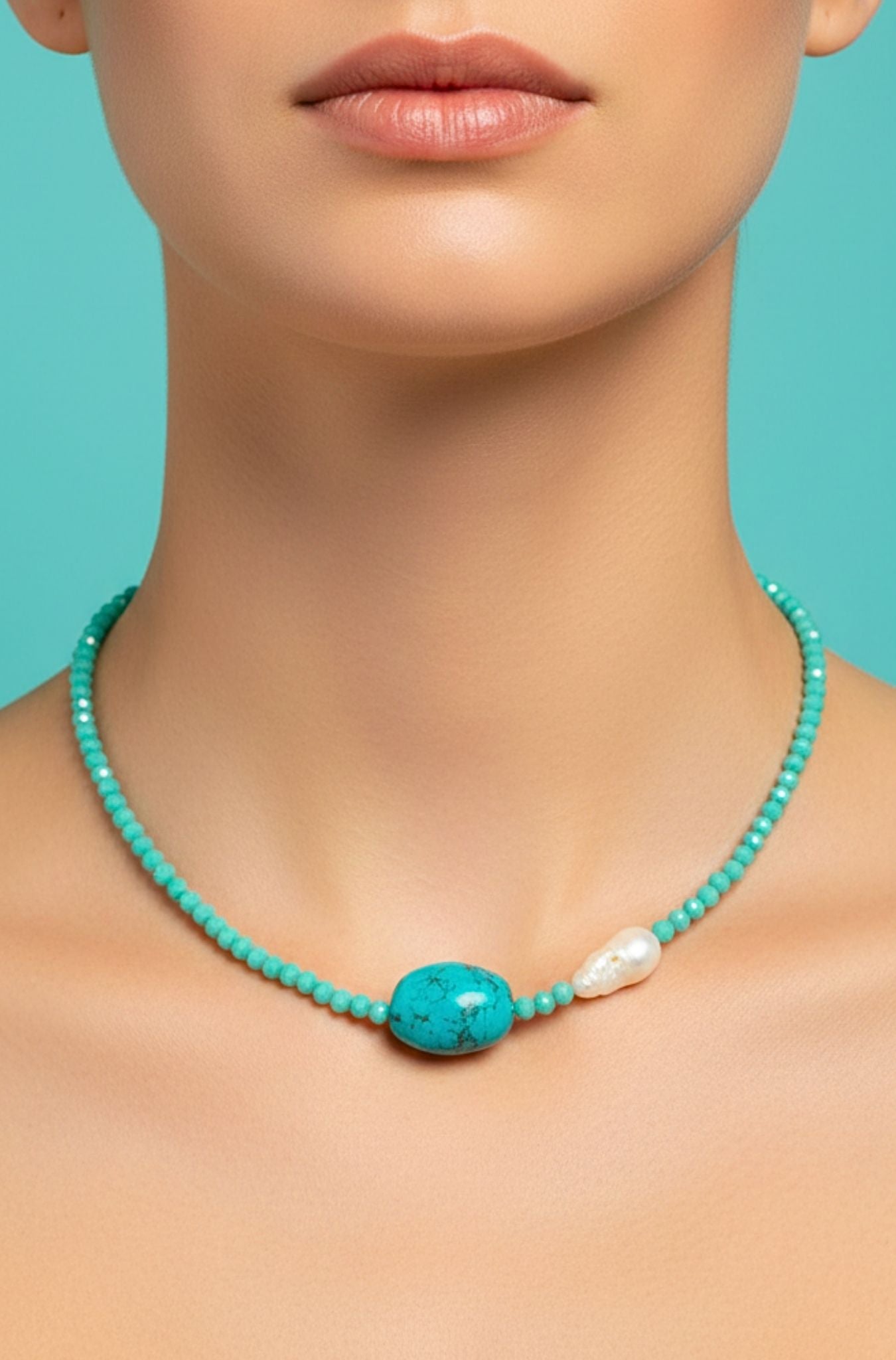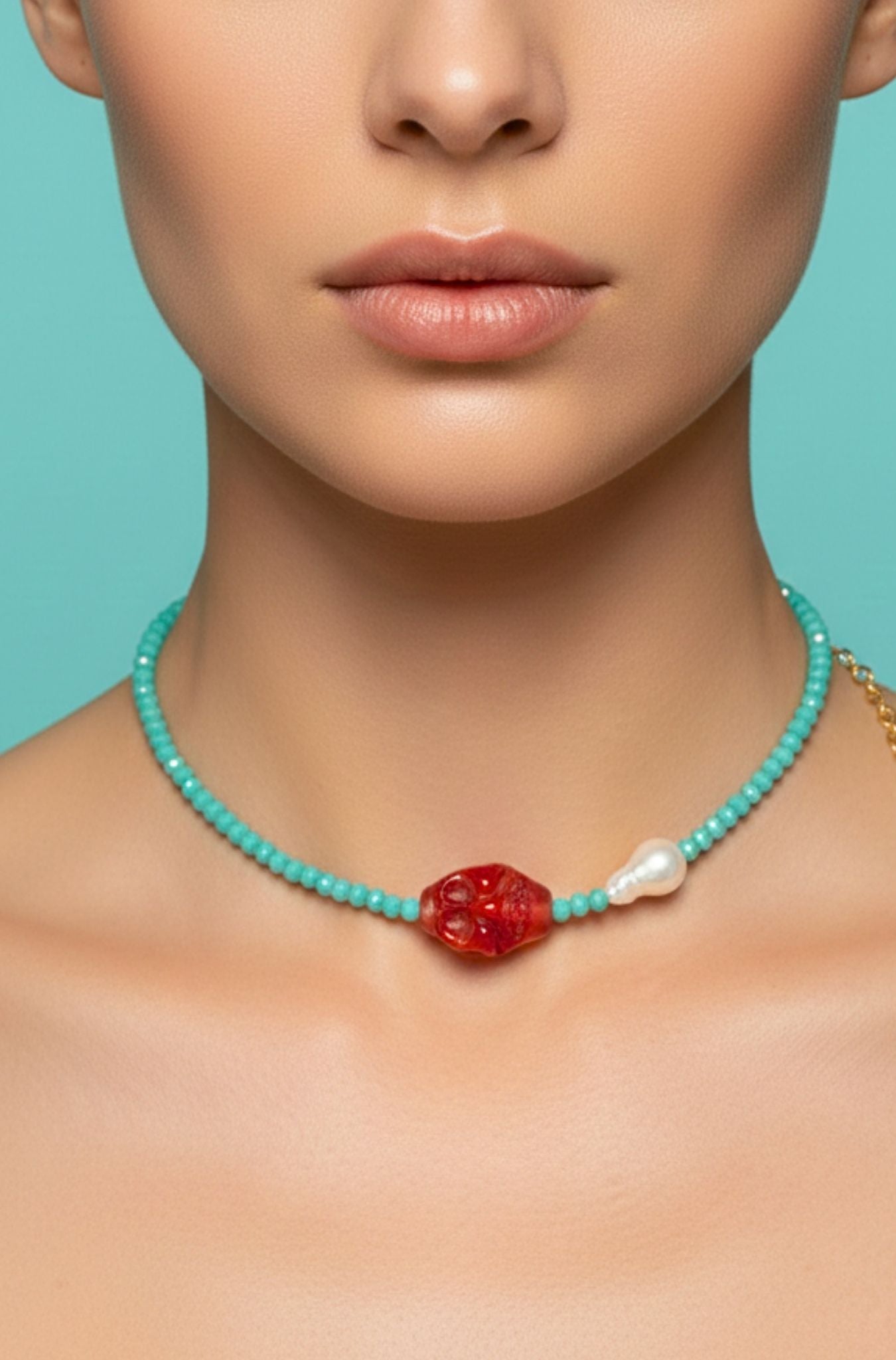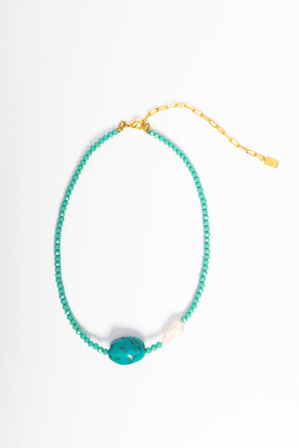 Dare to make a statement with the Meiko Necklace, a fearless design that pairs vibrant hot pink skull beads with rich faceted turquoise beads for an edgy-meets-elegant vibe. Anchored by a lustrous freshwater pearl, this piece balances bold attitude with timeless sophistication. Proudly handcrafted in the USA, it's the perfect accessory for anyone who refuses to play it safe. 24K Gold Plate. Lobster Claw Closure, Handcrafted in the U.S.A