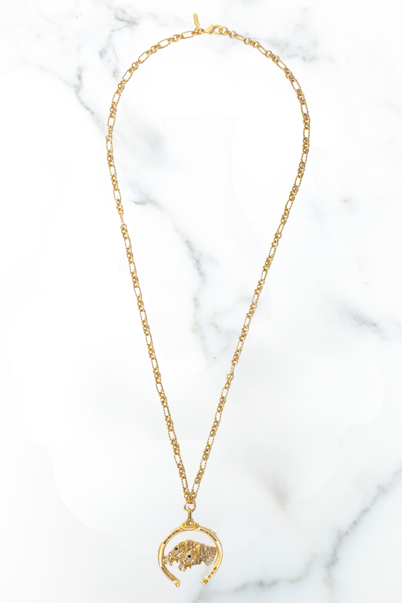 The Philippa Necklace features a delicate open link chain that beautifully complements its crystal-encrusted double horse head horseshoe charm. This elegant design adds a subtle sparkle while symbolizing luck and strength. Perfect for everyday wear, it offers a graceful touch to any outfit, making it a meaningful and stylish addition to your jewelry collection. 24K Gold Plate. Premium Crystals. Lobster Claw Closure. Proudly made in the U.S.A