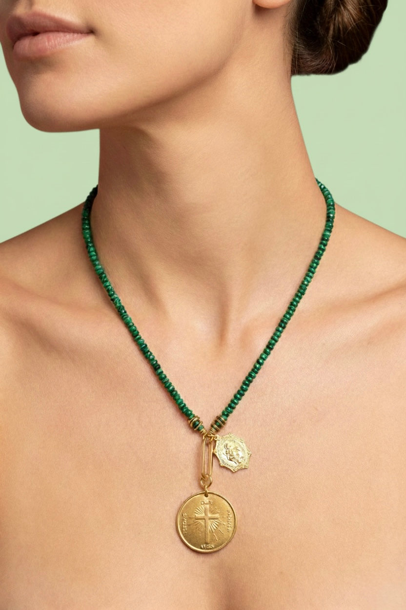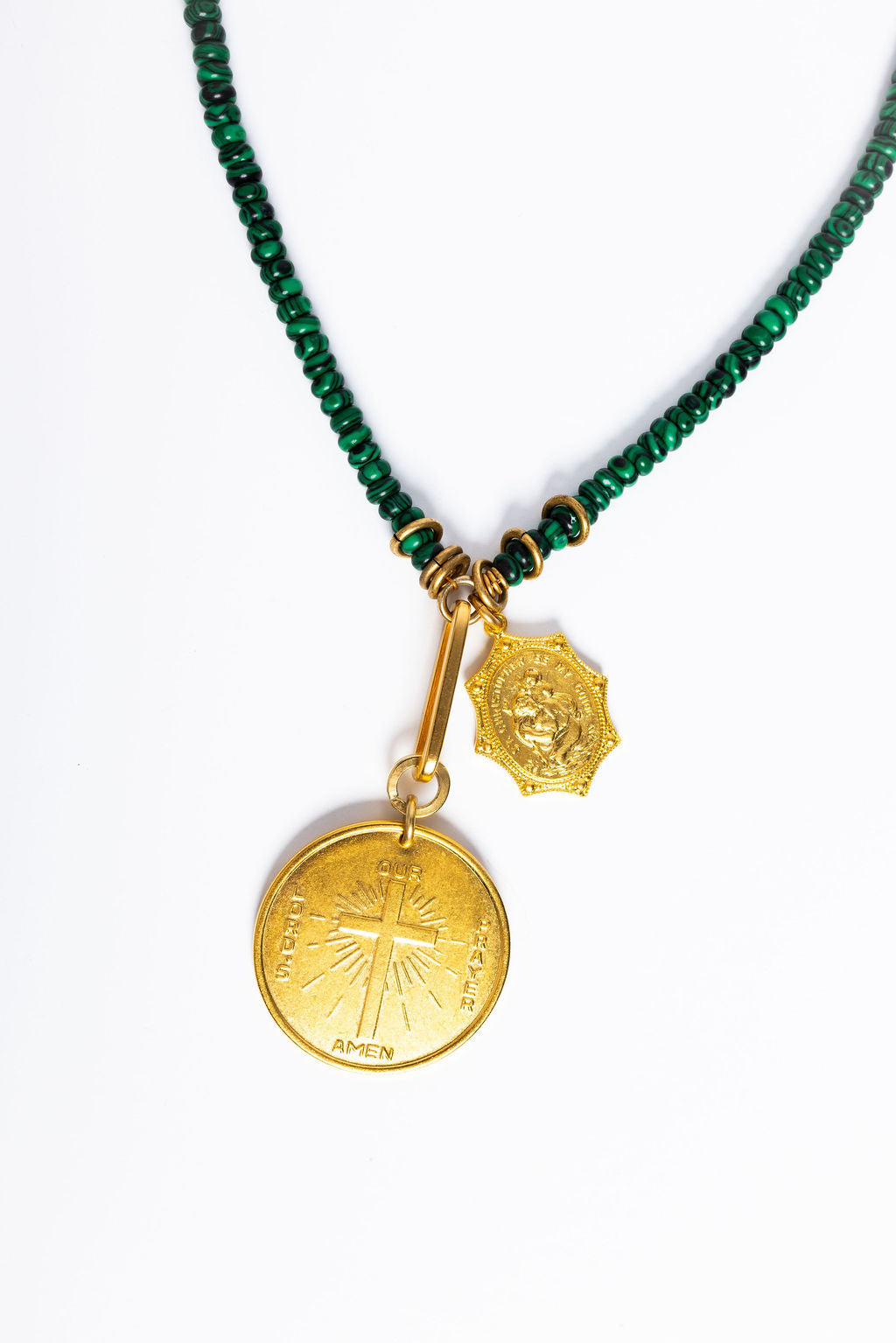 Embrace spiritual elegance with the Christiana Necklace, a meaningful piece that combines natural beauty with faith-inspired design. This striking necklace features rich faux malachite beads that create a luxurious foundation, paired with a bold Lords Prayer disc charm and a scalloped St. Christopher charm—both accented with  gold rings. Perfect for layering or wearing solo, this versatile necklace serves as a daily reminder of your beliefs while adding sophisticated style to any outfit. A thoughtful gift for yourself or someone special. 24K Gold Plate. Lobster Claw Closure. Proudly Handcrafted in the U.S.A