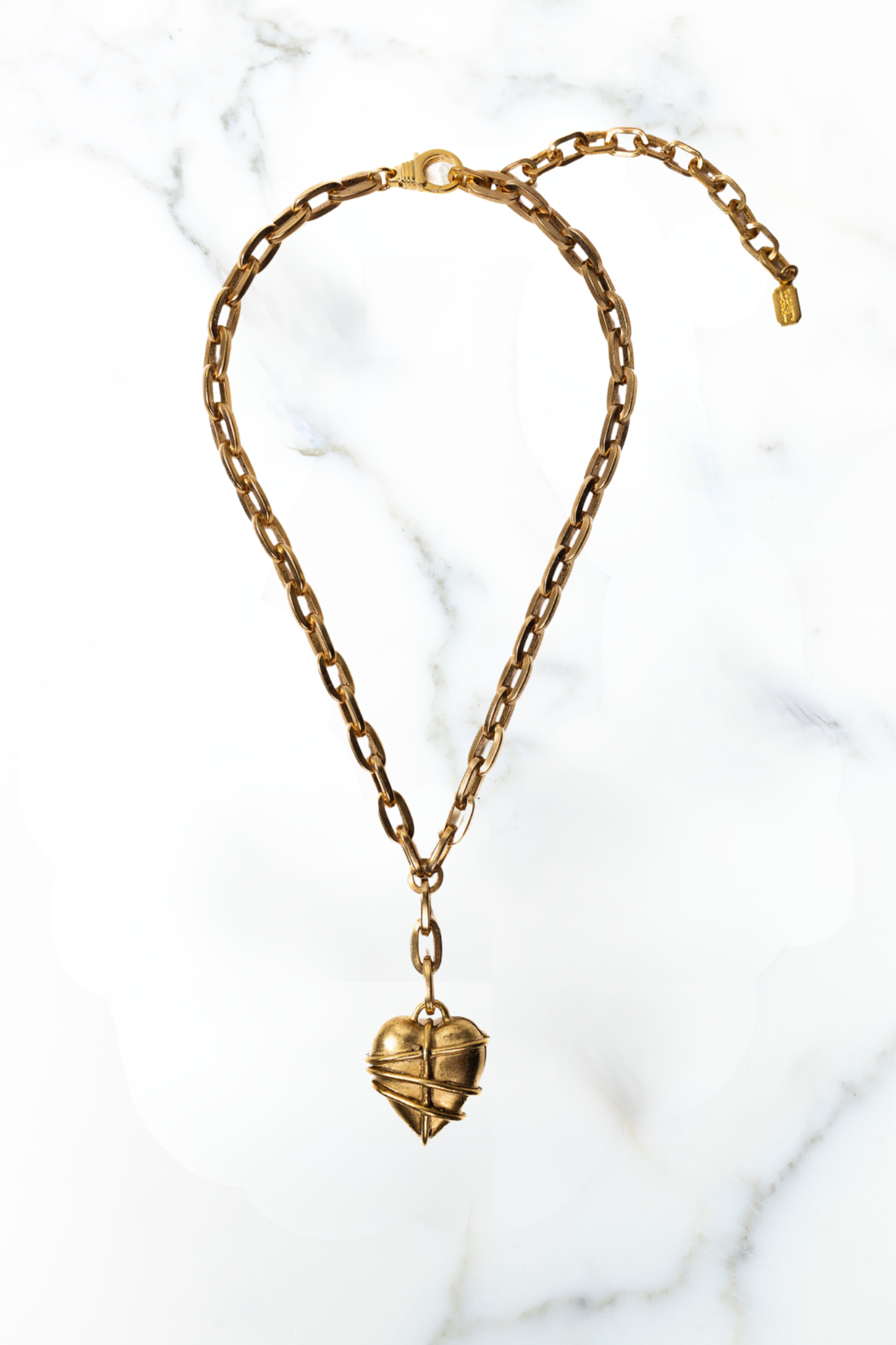 The Doralia Necklace makes a bold statement with its open link design and striking solid caged heart charm. This fearless piece challenges the ordinary, combining edgy style with a powerful symbol of passion. Perfect for those who want to stand out, it adds an adventurous edge to any outfit while celebrating the strength of the heart. Dare to wear your boldness. 24K Gold Plate. Lobster Claw Closure. Made in the U.S.A