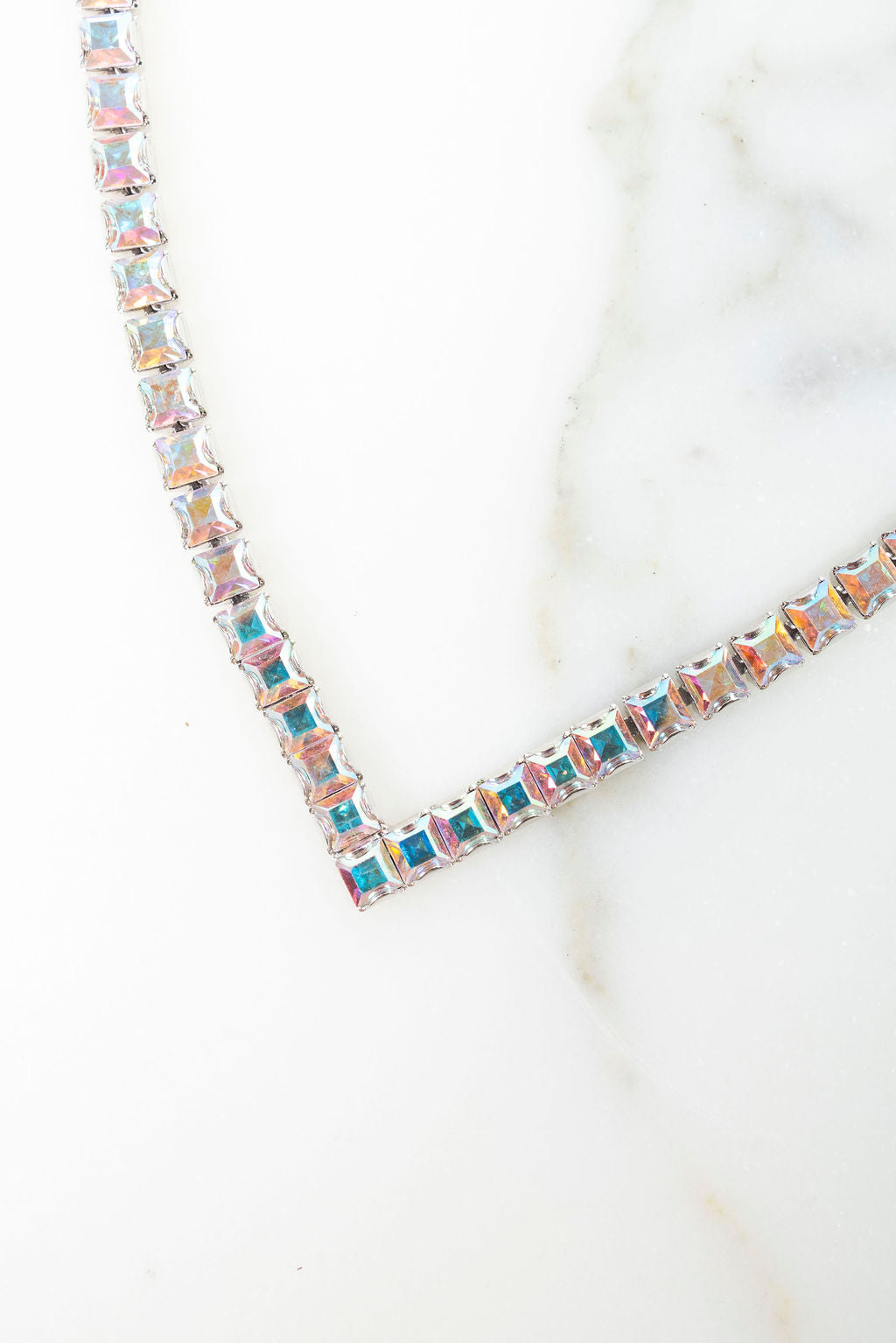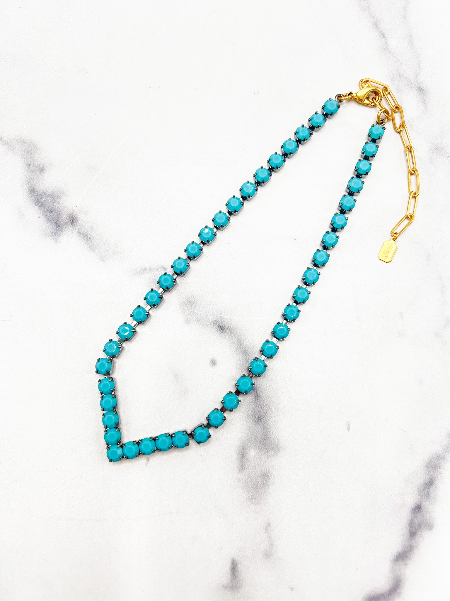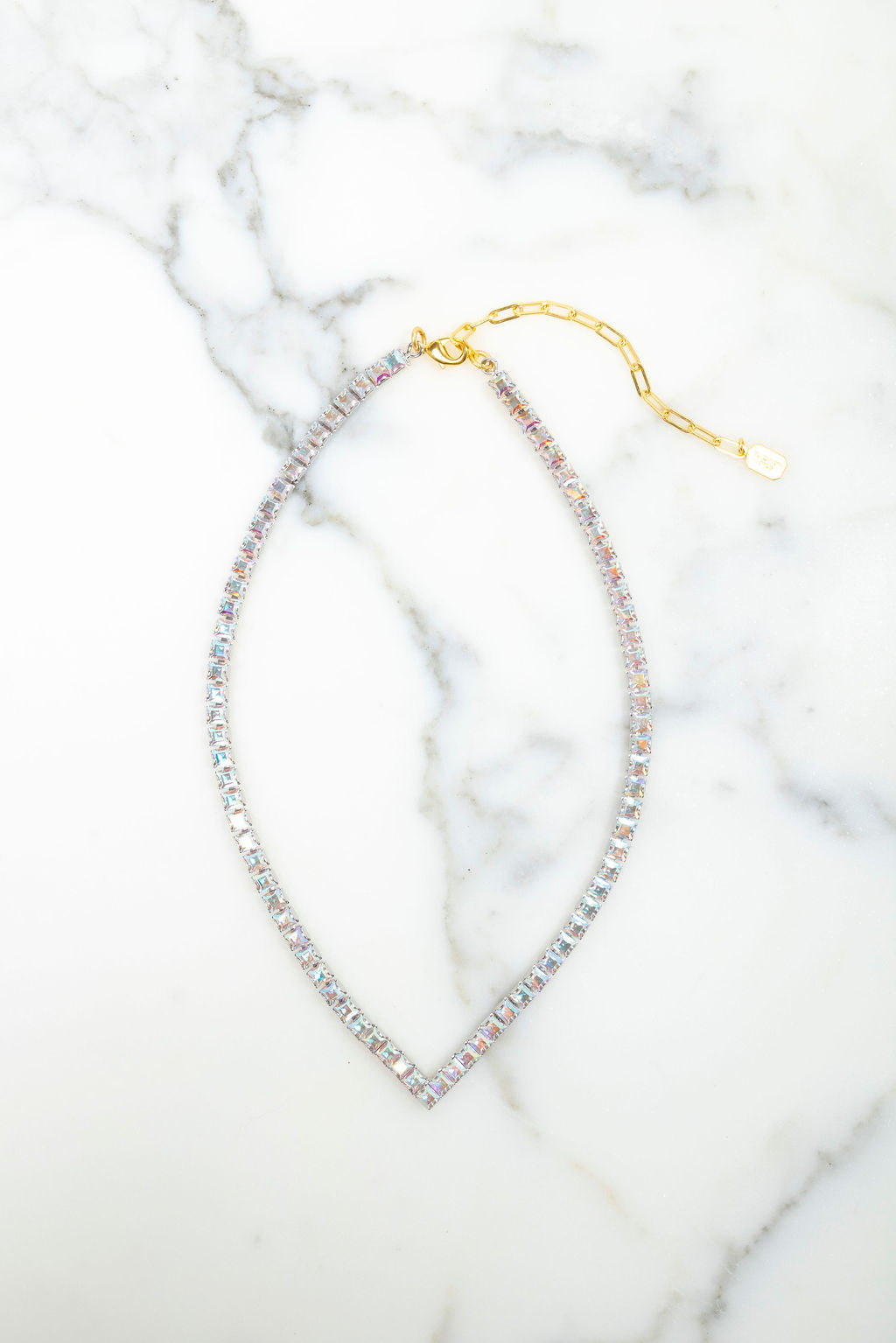We all love layering our delicate gold chain necklaces, but why not punch the look up a bit with a bit of glittering crystal? The Finn Necklace features a V shape right at the throat in beautiful glittering crystals. Czech Crystals, Lobster Claw Closure, Hematite Plate, Proudly Made in the USA.