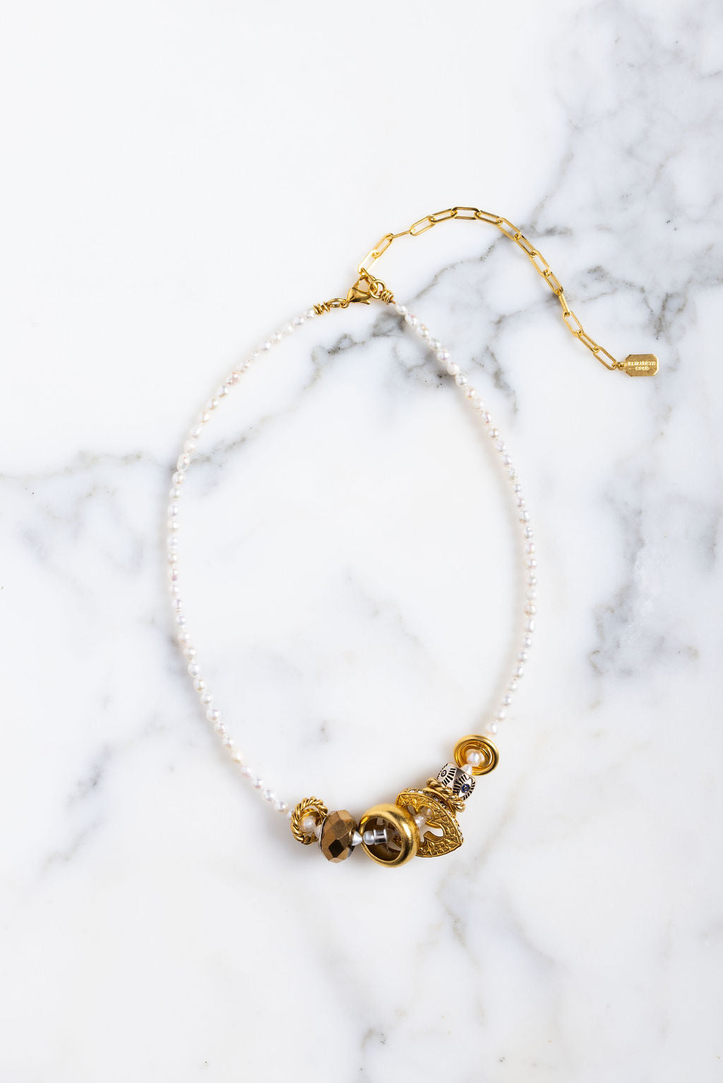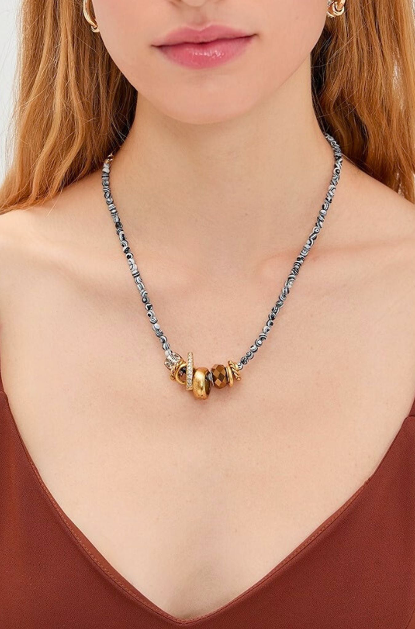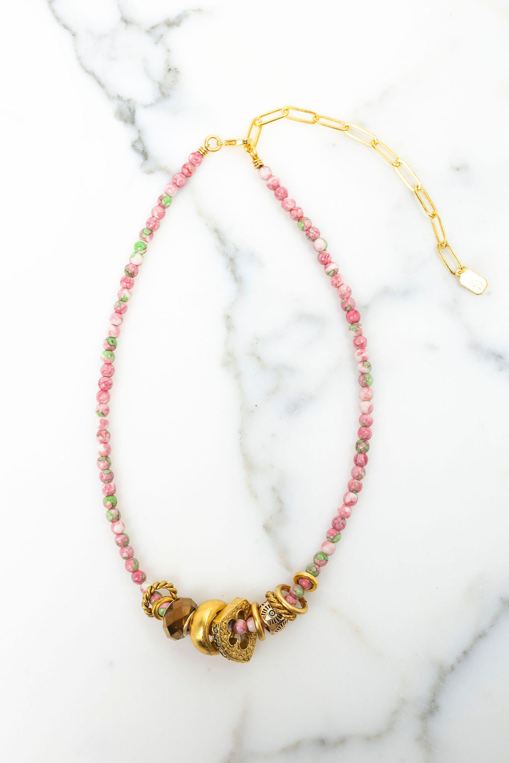 Take a daring leap with the Ines Necklace! Featuring a stunning  beaded neck adorned with various sized rings, this necklace also boasts an evil eye rondelle and a lucky clover center rondelle with crystal accents. Embrace the adventurous edge this piece brings to any outfit. Comes in green, pink, Light pink or Black and white Beads. 24K Gold Plated. Lobster Claw Closure. Proudly Made in the U.S.A.