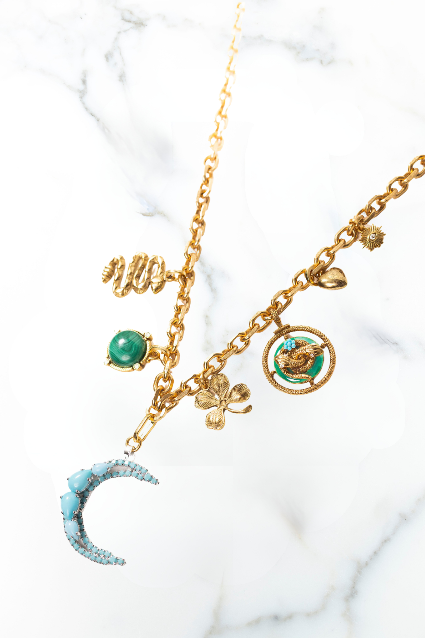 The Lunabeth Necklace commands attention with its bold design, featuring a striking faux turquoise crescent moon accented with a snake, faux malachite, a lucky clover, entwined snakes, a heart, and an evil eye charm, this daring piece blends mystique and symbolism for a fearless statement look. Perfect for those who aren’t afraid to stand out and express their unique energy.24K Gold Plate. Lobster Claw Closure. Made in the U.S.A