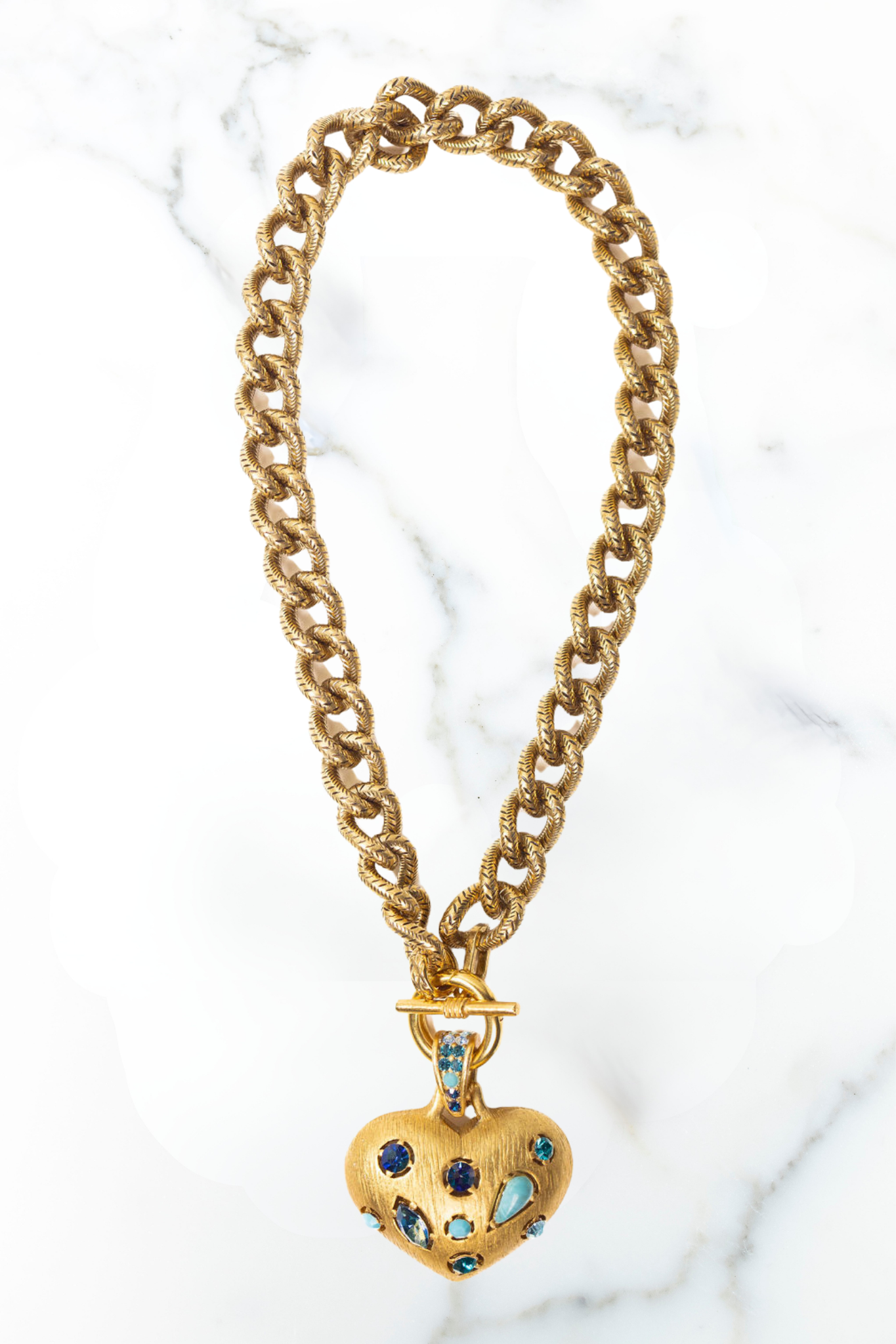 Make a bold statement with the Pauline Necklace—a daring textured open link chain featuring a striking heart charm adorned with crystals in various shapes and sizes. Choose between shades of blue or vibrant multicolored crystals to match your fearless style and add captivating sparkle to any outfit.24K Gold Plate. Premium Crystals. Front Toggle Clasp Closure. Proudly made in the U.S.A