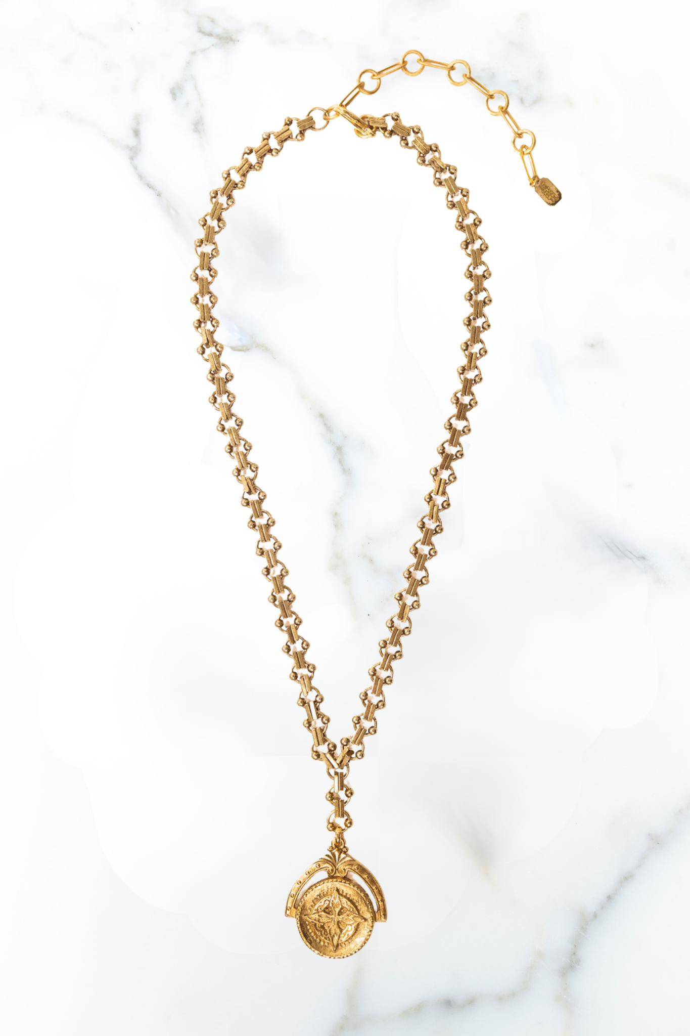 The Shavon Necklace features a mix of double oval and round links, complemented by a round disc charm with beautifully etched floral details and an etched arc at the top. This unique combination adds a touch of elegance and subtle artistry, making it a versatile piece to support your everyday style with grace. 24K Gold Plate. Lobster Claw Closure.  Proudly made in the U.S.A