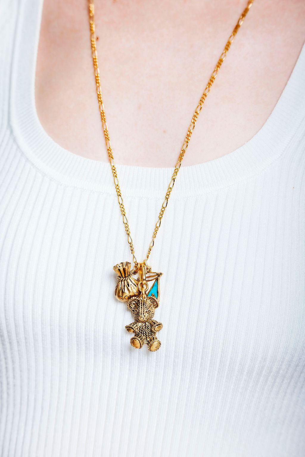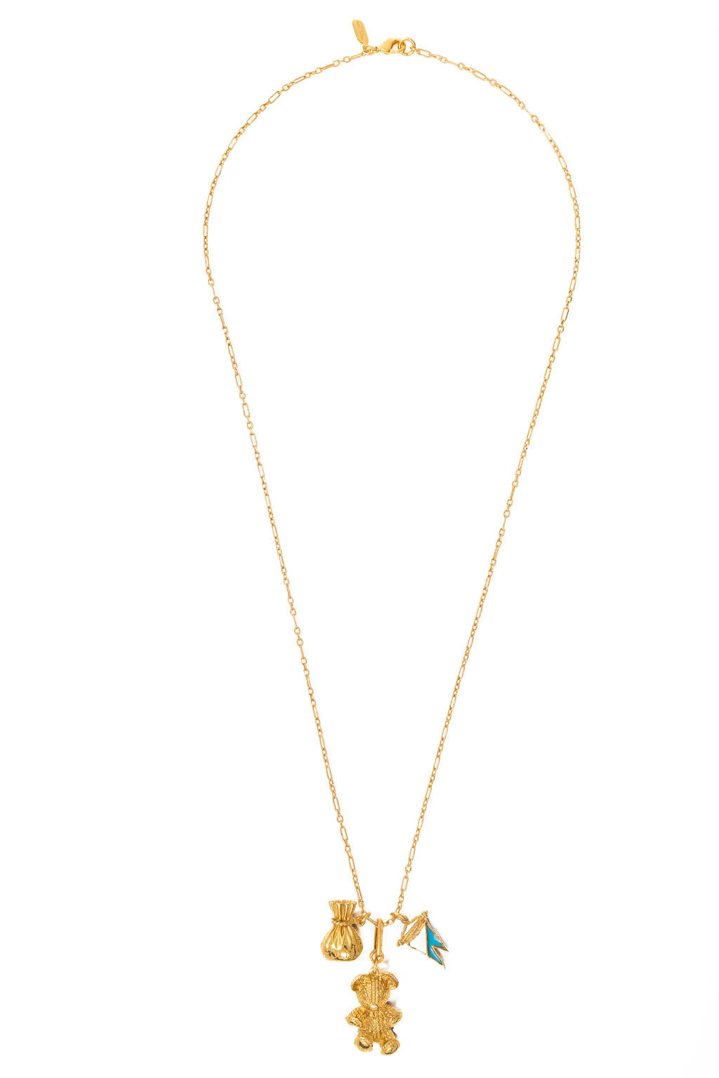 This playful Teddy Necklace features a delicate Figaro chain adorned with a textured teddy bear charm, a bag of gold charm, and a bright blue and white enamel flag charm. It's a fun and charming accessory that adds a touch of personality and joy to any outfit. 24k Gold Plate. Lobster Claw Closure. Proudly made in the U.S.A