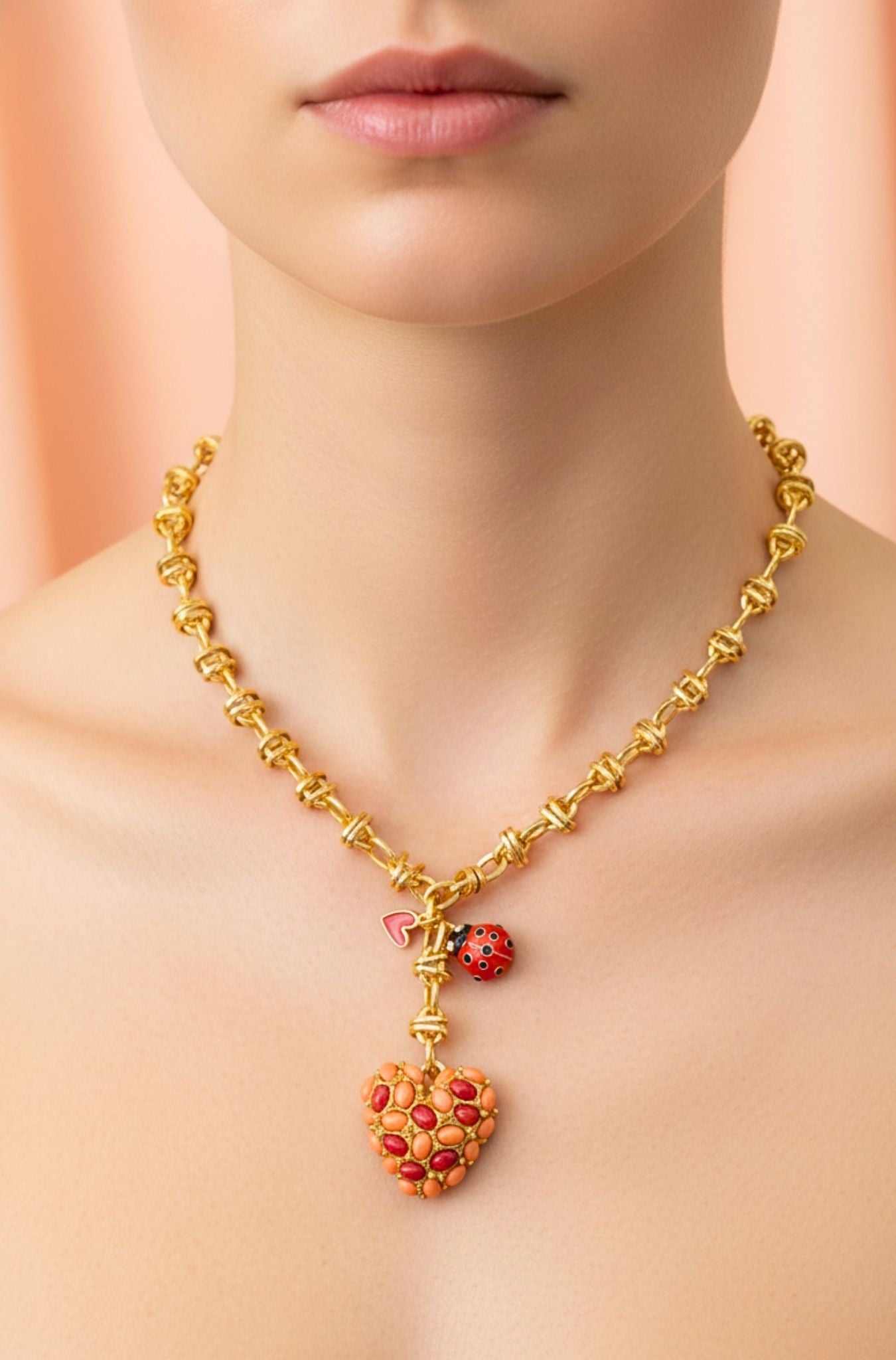 The Valencia Necklace invites you to embrace your authentic self. Featuring a open link Y-chain, this piece showcases a stunning heart charm with coral glass beads that dangles elegantly at its center, accompanied by a dainty red enamel heart and delightful ladybug accent. Together, these elements create a meaningful composition that celebrates love, luck, and the beauty of being true to who you are. Wear it as a personal reminder of your strength and worth. 24K Gold Plate. Lobster Claw Closure. Proudly made in the U.S.A